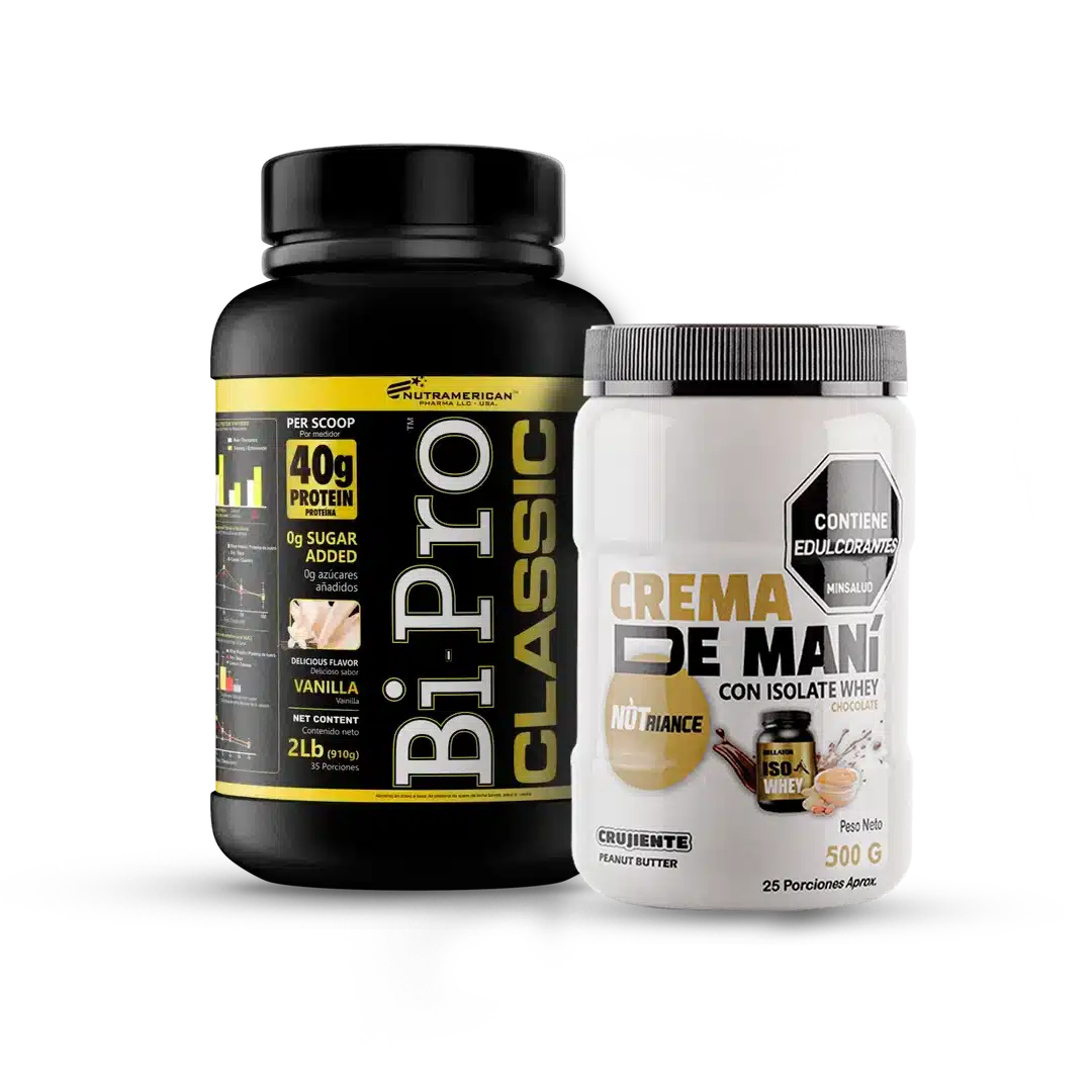 Bipro Classic es una proteína de suero pura, baja en grasa y lactosa, perfecta para recuperación muscular. Su rápida absorción la hace ideal tras entrenar. Acompañada de Crema de Maní ISO, hecha con maní natural y proteína aislada, sin azúcar ni conservantes. Un snack saludable y nutritivo para potenciar tu rendimiento.